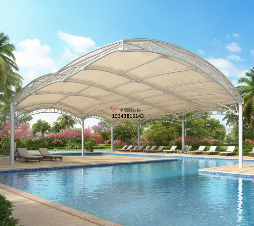 從景觀裝飾角度看,泳池膜結(jié)構(gòu)獨(dú)特的造型和輕盈的質(zhì)感,使其成為城市景觀設(shè)計(jì)中的重要元素。無論是在公園、廣場(chǎng),還是在商業(yè)綜合體的露天泳池,膜結(jié)構(gòu)都能與周圍環(huán)境相互映襯,增添城市的藝術(shù)氛圍和活力。