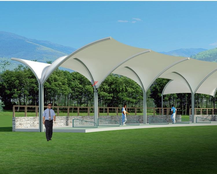 膜結(jié)構(gòu)景觀的控制荷載通常是風(fēng)載和雪載。在荷載作用下膜結(jié)構(gòu)景觀的變形較大,因此精確計(jì)算結(jié)構(gòu)的變形和應(yīng)力分布要用幾何非線性方法進(jìn)行。根據(jù)不同工況下計(jì)算出的索、膜、梁、桿等結(jié)構(gòu)構(gòu)件中的內(nèi)力分布的更不利情況,來選定索、膜等材料的型號(hào)及尺寸,確定詳細(xì)的節(jié)點(diǎn)做法及構(gòu)造措施等。
