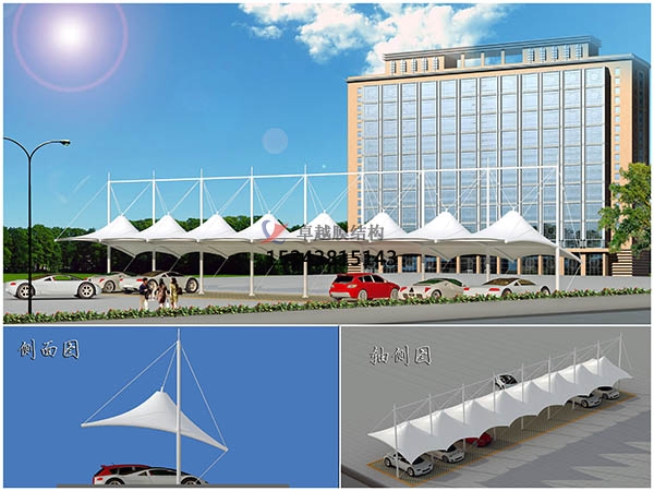 2.根據(jù)實(shí)地考察結(jié)果,設(shè)計(jì)合理的結(jié)構(gòu)圖。膜結(jié)構(gòu)充電樁車棚的設(shè)計(jì)非常重要, 既要考慮充電樁的大小尺寸又得考慮環(huán)境天氣,如果風(fēng)大雨雪大的地方盡量使用帶帽頂結(jié)構(gòu)的設(shè)施,這樣可以充分緩解風(fēng)雪的阻力和積雪融化后的處理。在風(fēng)力小或者有折風(fēng)墻的地方可以用直挑或者七字型膜結(jié)構(gòu)車棚,這樣可以節(jié)省工程成本縮短施工工期。