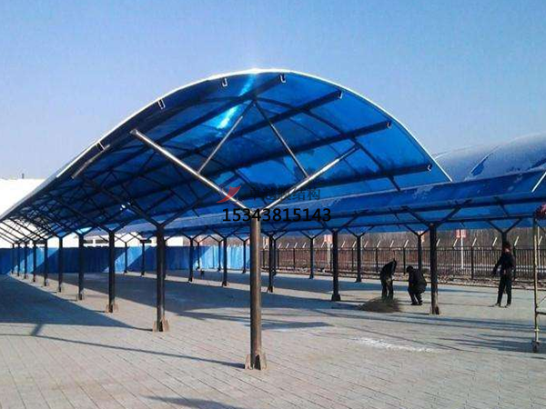 膜結(jié)構(gòu)車棚的篷布采用PVC/PVDF/PTFE/ETFE,而膜材的更大特點是強度高、耐久性好、防火難燃、自潔性好,不受紫外線影響,使用壽命長,一般15-30年。具有高透光率,透光率為13%,對熱能反射率73%,熱吸收量很少。正是因為這種劃時代的膜材料的發(fā)明,使膜結(jié)構(gòu)車棚成為現(xiàn)代化的永久建筑。