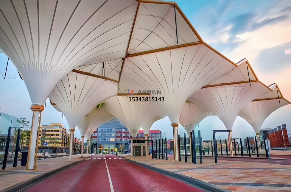 膜結(jié)構(gòu)以其卓越的造型能力著稱。在廣場(chǎng)上,張拉膜結(jié)構(gòu)通過拉索將膜材料張拉于結(jié)構(gòu)上,能夠塑造出如波浪起伏、風(fēng)帆揚(yáng)起、花瓣綻放等充滿動(dòng)感與張力的造型。這些獨(dú)特的形態(tài)不僅成為廣場(chǎng)上的視覺焦點(diǎn),更能極大地提升廣場(chǎng)的藝術(shù)感染力,使其成為城市地標(biāo)性景觀。在公園中,膜結(jié)構(gòu)景觀亭可被設(shè)計(jì)成傘狀、蘑菇狀、飛鳥狀等,與自然環(huán)境相得益彰,為公園增添靈動(dòng)與趣味,成為游客拍照打卡的熱門點(diǎn)位。