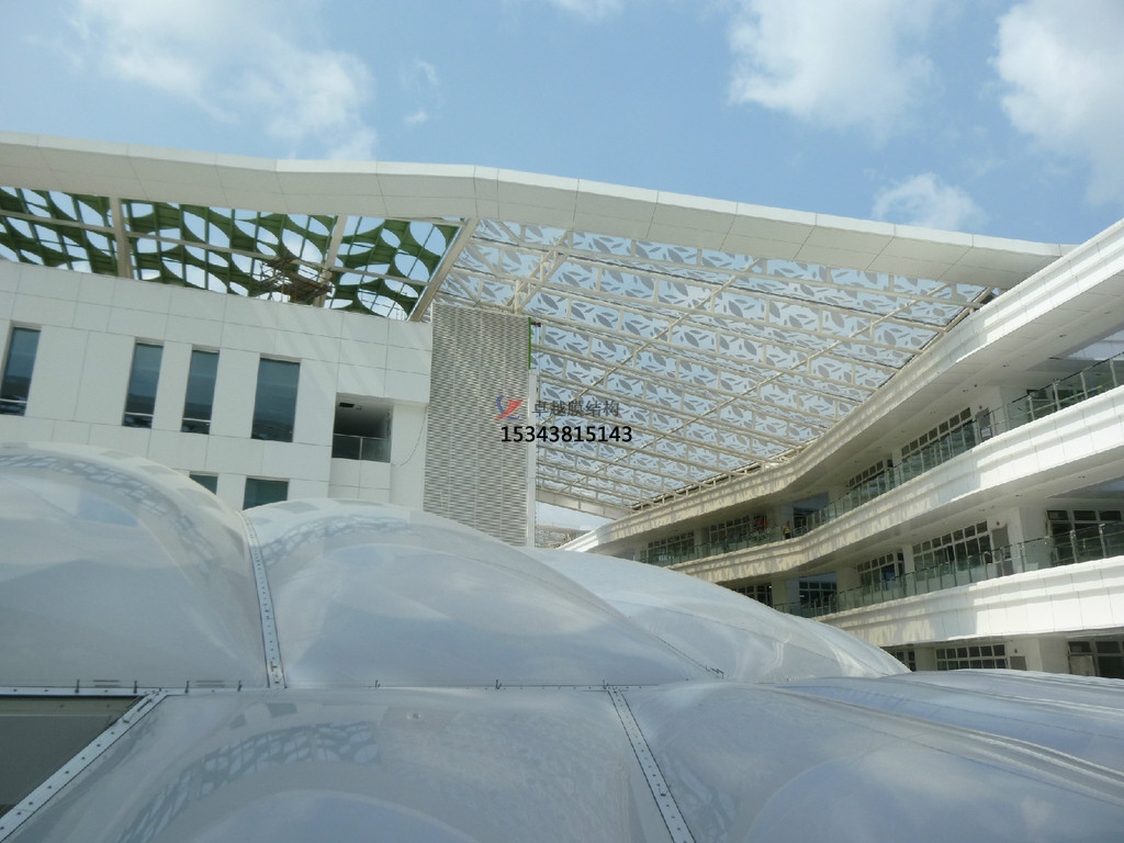 1.造型多變。山南ETFE膜結(jié)構(gòu)與其他膜結(jié)構(gòu)稍稍有些不同,它采用一小片一小片的ETFE膜材料安裝在多變的鋼構(gòu)件中,其造型可根據(jù)鋼構(gòu)件的造型而變,如:伊甸園的六邊形,水立方的不規(guī)則形狀等,賦予了建筑鮮活的生命,讓人一眼便能記住。