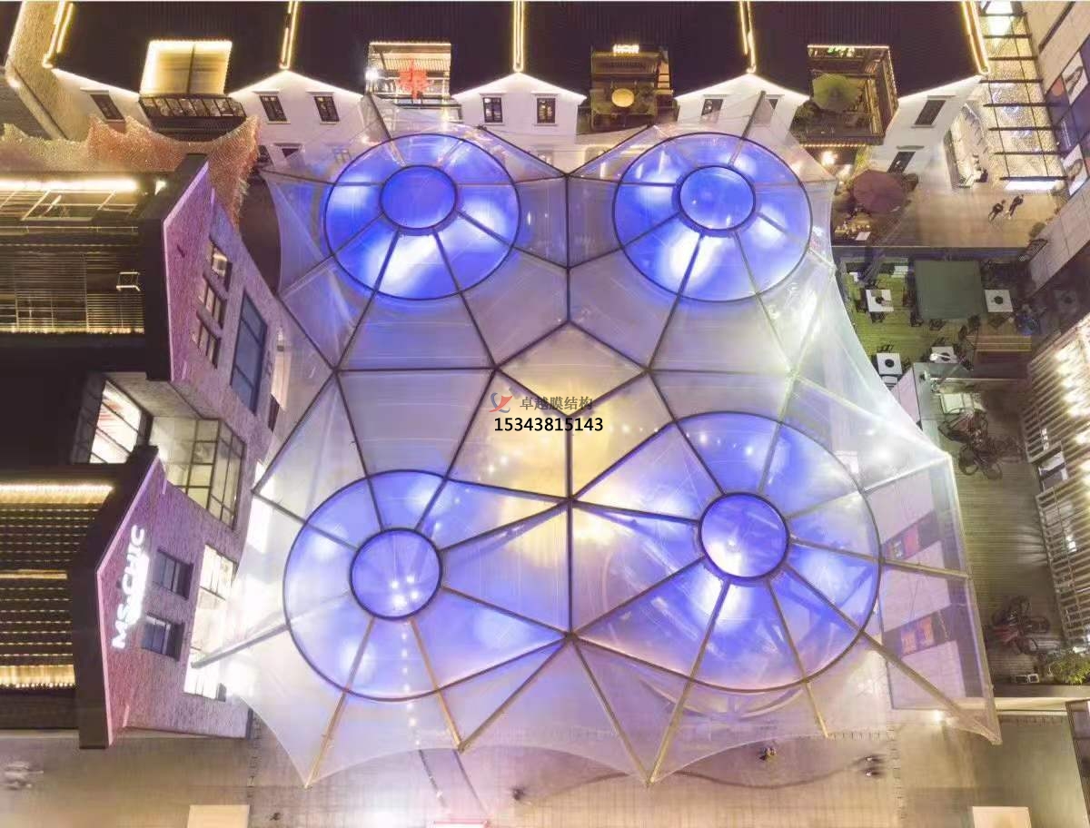 4、PTFE 膜材料特點說明:PTFE膜材料的織物基材為玻璃纖維,纖維的直徑范圍應在3.30~4.05μm 范圍內(nèi),重量應大于150g/m。<涂層的主要材料應為聚四氟乙烯樹脂,含量應不低于90%,涂層的重量在應大于400g/m。PTFE膜材料的厚度宜大于0.5mm。能防止化學腐蝕和紫外線侵蝕,不易老化,在雨水中具有自潔性能