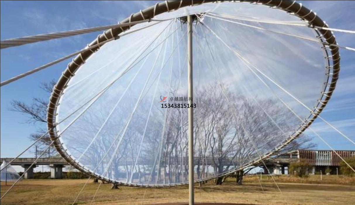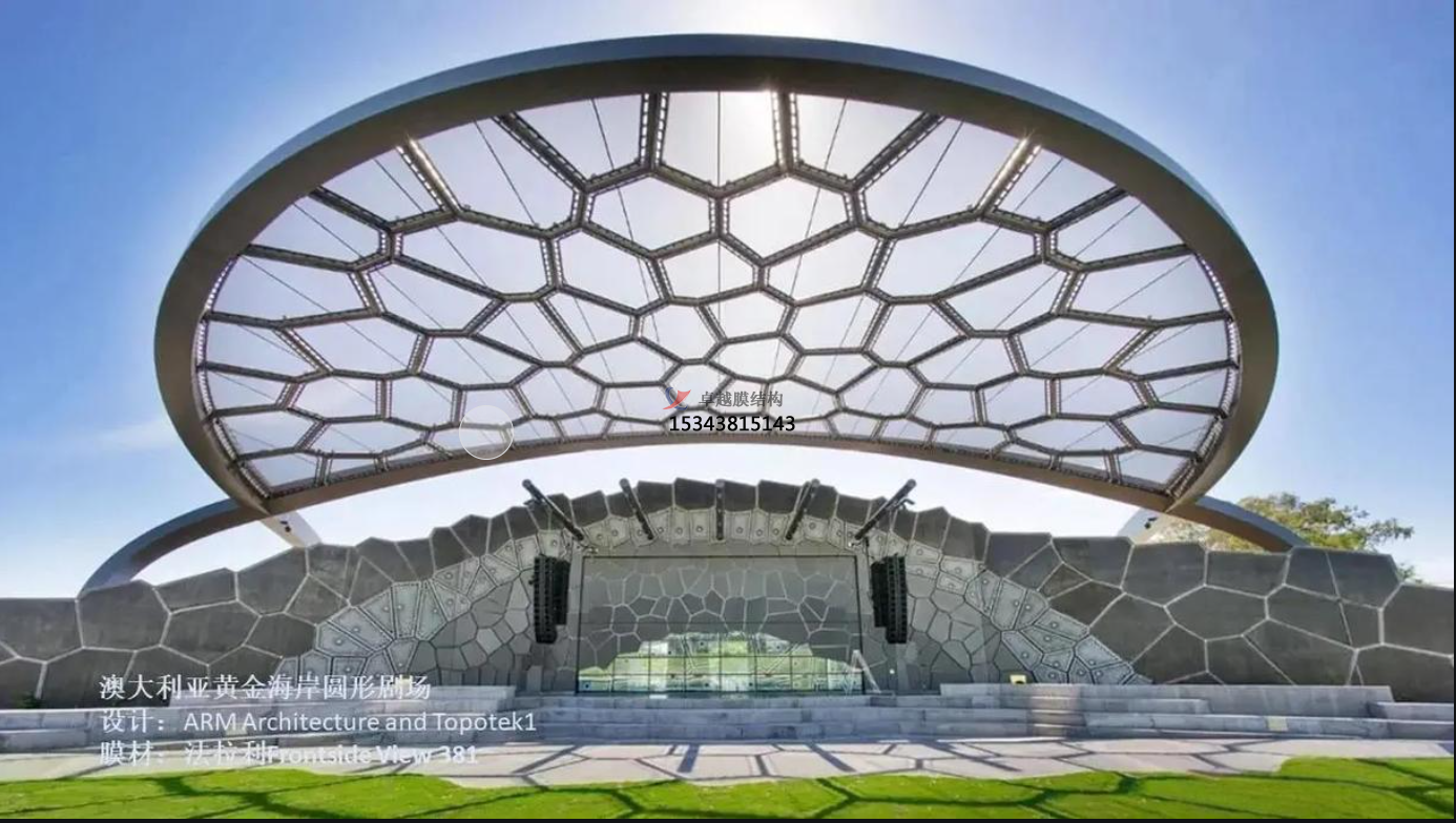 STFE不是化學(xué)成分的英文縮寫,而是膜材商品名的英文縮寫(Structural、Transparent、Fluorinated、Envelope),其本質(zhì)是網(wǎng)格覆膜。區(qū)別在于其織物基材,不同于PVC膜材的聚酯纖維紗線,也不同于PTFE膜材的玻璃纖維紗線,而是擠壓特殊涂層的聚芳酯紗線;覆膜為特種含氟聚合物(涉及商業(yè)秘密未公開),單面覆膜。覆膜的清晰度較好,可實(shí)現(xiàn)一定程度的透景。同時(shí),由于有織物基材提高了膜材強(qiáng)度,抗拉強(qiáng)度可達(dá)4000N/5cm。即使不加拉索,膜單元跨度一般在3m以上。