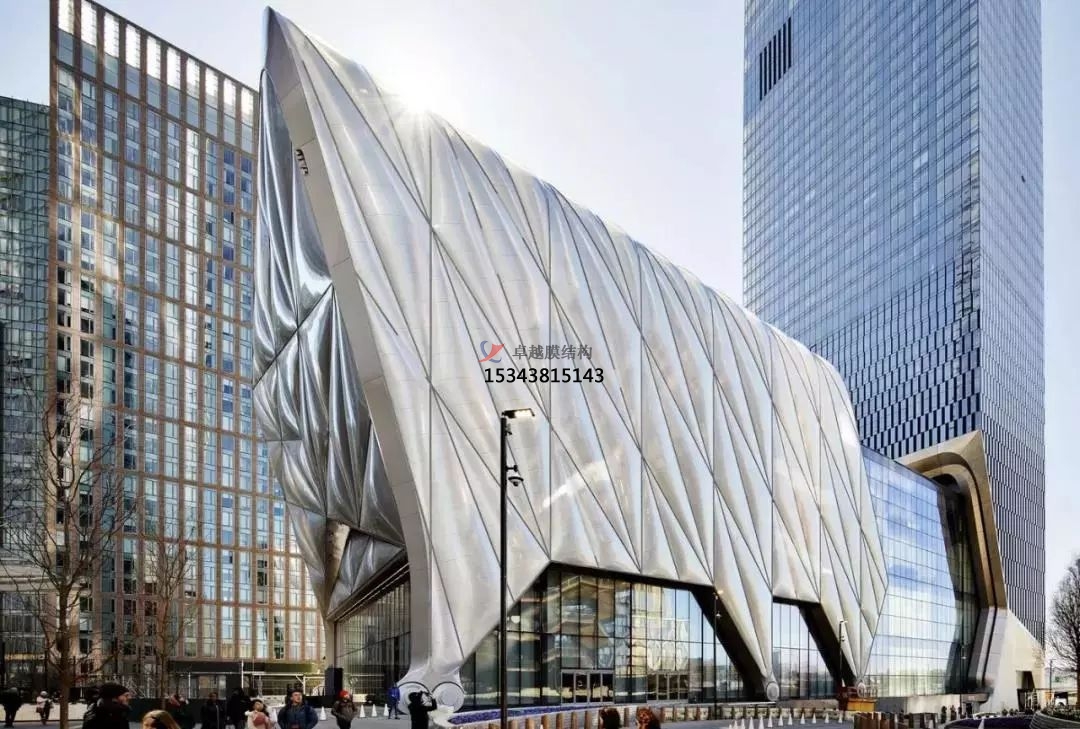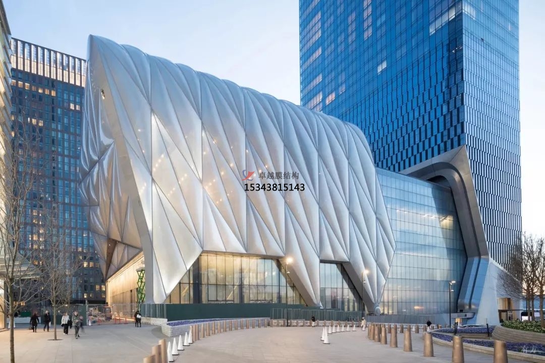 在哈德遜碼頭上,全新的跨界“棚屋”藝術(shù)中心(The Shed)于2019年4月5日對(duì)外開放。藝術(shù)中心由著名建筑公司 Diller Scofidio+Renfro 和 Rockwell 集團(tuán)合作設(shè)計(jì),打造了覆蓋著ETFE氣枕膜材料的120英尺的伸縮式外殼,能夠通過(guò)滾輪將建筑延伸至“棚屋”的戶外廣場(chǎng),營(yíng)造更開闊的半戶外空間,旨在創(chuàng)建世界上最具靈活性的文化機(jī)構(gòu)。