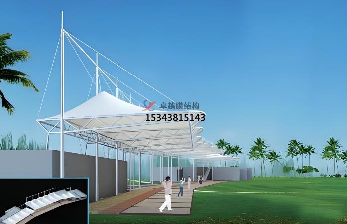 應(yīng)用場景:發(fā)球臺罩棚,看臺與觀賽區(qū),停車棚與配套設(shè)施,景觀與休閑區(qū)。發(fā)球臺罩棚為球員提供遮陽、避雨的空間,造型靈活美觀,與球場自然環(huán)境融合??磁_與觀賽區(qū)大跨度膜結(jié)構(gòu)看臺可覆蓋大量觀眾,輕量化設(shè)計降低基礎(chǔ)成本,同時具備通透視野。停車棚與配套設(shè)施則保護車輛免受紫外線、雨水侵蝕,常見于高爾夫球場入口或停車場。景觀與休閑區(qū)膜結(jié)構(gòu)為小品、廊道等提升球場景觀性,營造現(xiàn)代感。