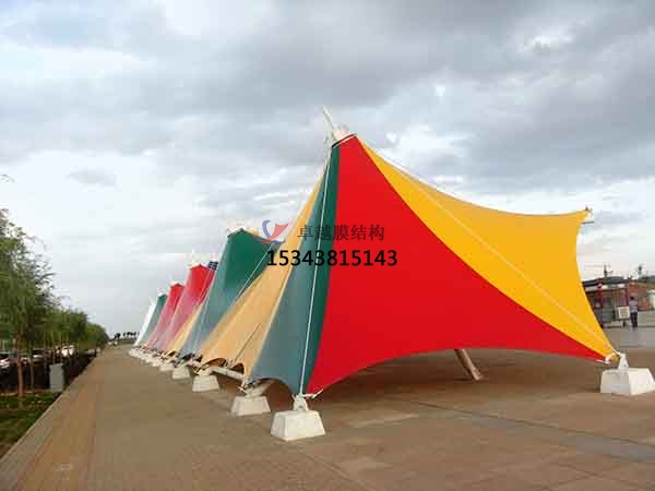 索膜結(jié)構(gòu)景觀棚的特點:索膜結(jié)構(gòu)景觀棚具有造型美觀獨特、輕質(zhì)高強、環(huán)保節(jié)能和自潔性強等特點。索膜結(jié)構(gòu)可以通過調(diào)整張拉力和支撐點的位置,創(chuàng)造出各種獨特的形態(tài),如波浪形、穹頂形、風帆形等,甚至可以設(shè)計成抽象的藝術(shù)圖案,具有強烈的雕塑感和現(xiàn)代藝術(shù)氣息,能夠為環(huán)境增添獨特的景觀效果。膜材一般采用高強度的纖維織物,如玻璃纖維、聚酯纖維等,重量輕但強度高,其自重比傳統(tǒng)建筑結(jié)構(gòu)小得多,同時卻能承受較大的荷載,在大跨度空間的應(yīng)用上具有優(yōu)勢,可有效降低基礎(chǔ)和支撐結(jié)構(gòu)的荷載。膜材具備良好的耐候性和抗老化性能,使用壽命較長,一般可達十年以上,減少了頻繁更換帶來的資源浪費和環(huán)境污染。而且部分膜材可回收再利用,符合當今社會提倡的綠色發(fā)展理念。一些高品質(zhì)的膜材表面具有防護涂層,能夠使膜面具有自潔功能,雨水沖刷即可帶走表面的灰塵和污垢,保持膜面的清潔,降低了維護成本。