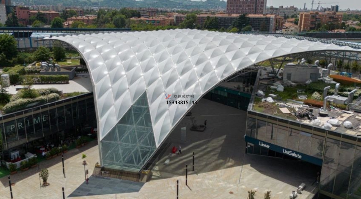 商業(yè)購(gòu)物中心的主要特點(diǎn)是因商業(yè)店鋪的集中而形成了室內(nèi)室外購(gòu)物、休閑、餐飲等功能空間,步行街及中央活動(dòng)區(qū)域是人們行走、休息、交流的開(kāi)放空間,基于商業(yè)街特色,就決定了所有設(shè)計(jì)的核心就是讓空間更具人性化。屋頂作為建筑附加設(shè)施,不僅要求遮陽(yáng)避雨的實(shí)用功能,也應(yīng)該是錦上添花的設(shè)施。目前國(guó)內(nèi)外膜結(jié)構(gòu)應(yīng)用于商業(yè)綜合體的工程案例越來(lái)越多,膜結(jié)構(gòu)建造的屋頂擁有很多傳統(tǒng)屋頂所不具備的優(yōu)勢(shì)特點(diǎn)。