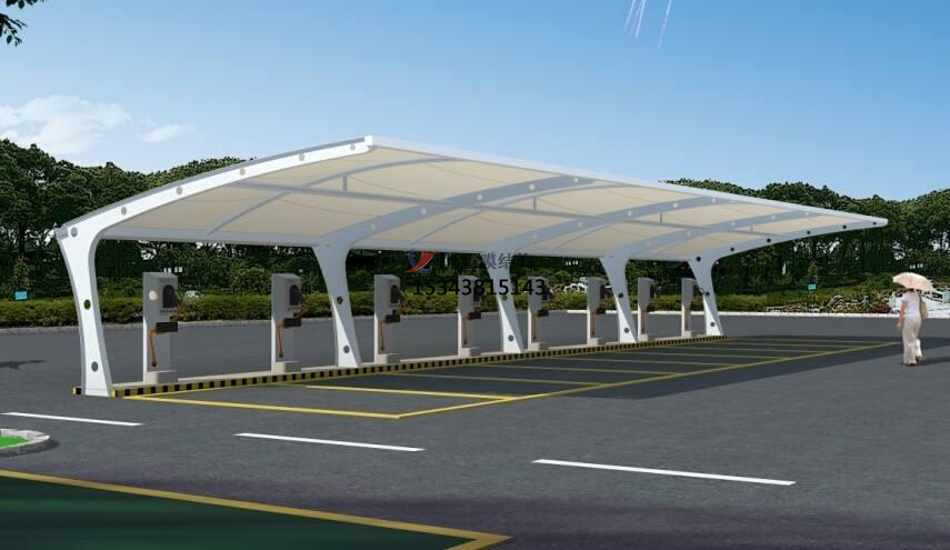 3.商業(yè)廣場雨棚搭建頂部的密封板加蓋有棕褐色(顏色可選擇)日光板,與棚整體框架用分層鉚接固定,耐酸堿腐蝕,有足夠的強(qiáng)度維持棚內(nèi)車輛。