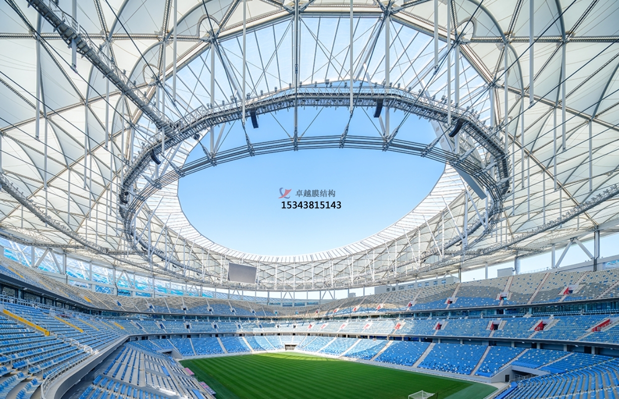 ETFE 膜的柔性特質(zhì)要求支撐結(jié)構(gòu)兼具強(qiáng)度與適應(yīng)性。典型案例如廈門新體育中心,采用 “巨拱 + 車輻式索網(wǎng)” 體系,通過(guò) 40 榀索桁架與內(nèi)環(huán)索形成三維受力網(wǎng)絡(luò),并在徑向索上方疊加獨(dú)立索網(wǎng),最終以 722 道托膜索與鋁合金槽實(shí)現(xiàn)膜面精準(zhǔn)張拉。這種設(shè)計(jì)不僅滿足了 86 米高空作業(yè)的穩(wěn)定性需求,更通過(guò)曲面造型優(yōu)化了排水效率。