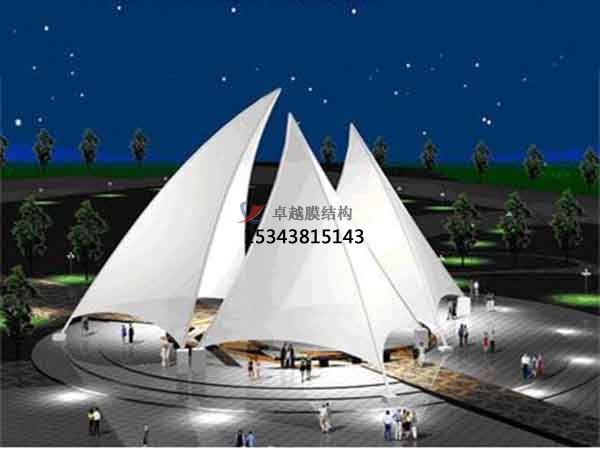 景觀膜結(jié)構(gòu)的獨(dú)特曲面外形使其具有強(qiáng)烈的雕塑感。膜面通過張力達(dá)到自平衡。負(fù)高斯膜面高低起伏具有的平衡感使體型較大的結(jié)構(gòu)看上去像擺脫了重力的束縛般輕盈地 雕塑般的質(zhì)感令人激動,更好的膜結(jié)構(gòu)設(shè)計(jì)是結(jié)構(gòu)與外形的有機(jī)融合,使其顯得了類拔萃,同時(shí)與自然環(huán)境、歷史及現(xiàn)代的城市景觀有機(jī)結(jié)合。輕型結(jié)構(gòu)可以看成是大型的雕塑作品,可為其周邊空間增添活力,成為周圍環(huán)境的補(bǔ)充和焦點(diǎn)。利用膜材的透光性和反射性,經(jīng)過設(shè)計(jì)的人工燈光也可使膜結(jié)構(gòu)成為光的雕塑。