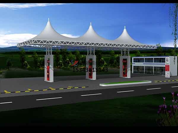 一、造型獨(dú)特,辨識(shí)度高,由于膜材重量輕,適合加油站這種大跨度的建筑,而且是采用張力結(jié)構(gòu)所以在造型設(shè)計(jì)上具有很大的優(yōu)勢(shì),可以實(shí)現(xiàn)非常具有藝術(shù)氣息的造型。