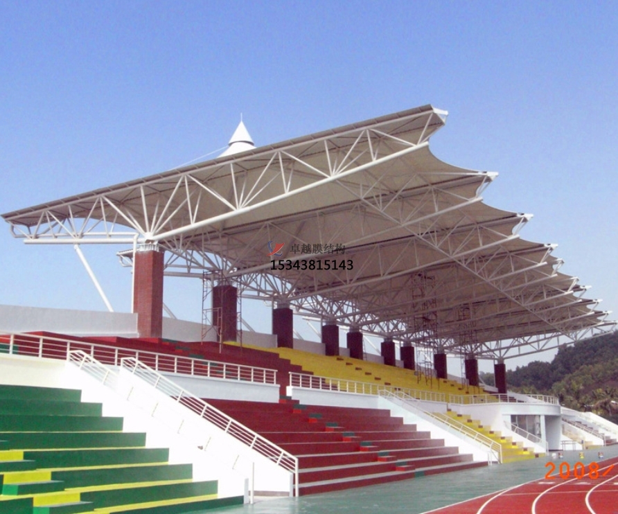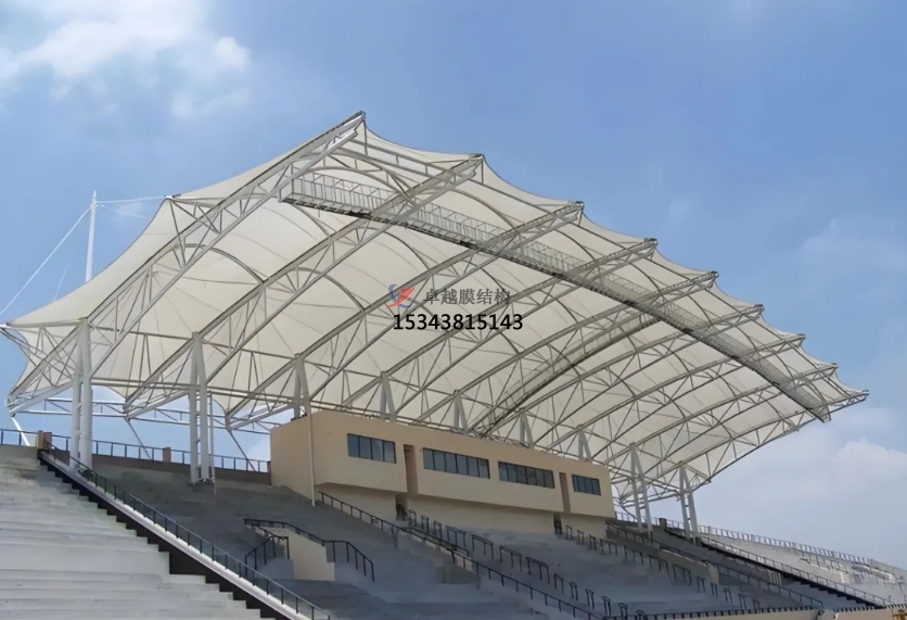 膜結(jié)構(gòu)體育看臺與傳統(tǒng)看臺相比,具有造型優(yōu)美,空間跨度大,自重輕,使用年限時間長等特點。膜結(jié)構(gòu)的張拉樣式使得建筑的空間跨度變得更大,同時能縮小建筑的結(jié)構(gòu),建筑的整體重量減輕,這樣施工就會變的簡單安全。