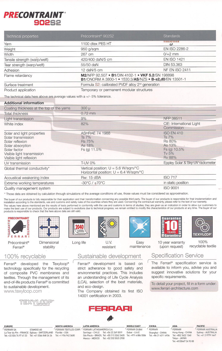 法拉利膜材十多年來(lái),法拉利(PVDF)表面處理的復(fù)合膜材被應(yīng)用在全世界重要的織物建筑工程中?,F(xiàn)在,第代膜材再次確認(rèn)了這一出眾材料性能的更新發(fā)展。法拉利研發(fā)了第代材料正是為了滿足建筑師和業(yè)主在新世紀(jì)之初對(duì)于織物建筑提出的要求。這一 全新的膜材得益于更新的科研技術(shù),即將PVDF和硬化介體完美地結(jié)合。這種特殊的結(jié)合明顯地提高了材料的機(jī)械強(qiáng)度、使用壽命,并能長(zhǎng)期保持織物建筑的原始 美觀。第代膜材在積累了10多年的經(jīng)驗(yàn)的基礎(chǔ)上,可以提供專業(yè)保證。法拉利現(xiàn)在能夠根據(jù)要求和每個(gè)項(xiàng)目的具體情況,提供12年質(zhì)量保證 (PRECONTRAINT702除外)。