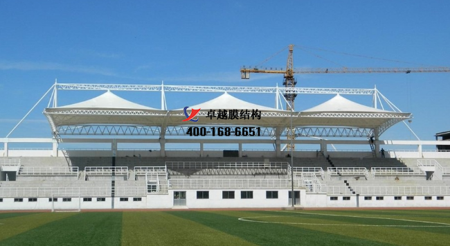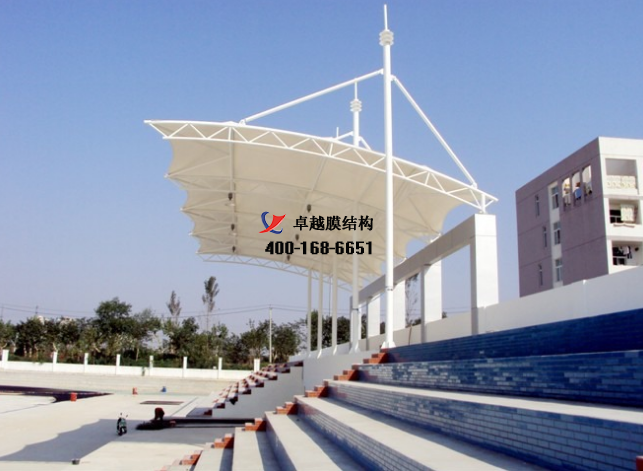 膜結(jié)構看臺,周口體育場膜結(jié)構看臺頂棚,膜結(jié)構看臺雨棚,操場主席臺遮陽棚等張拉形式膜結(jié)構的先行者是德國的奧托(F.Otto),他在1955年設計的張拉膜結(jié)構跨度在25m左右,用于聯(lián)合公園多功能展廳。