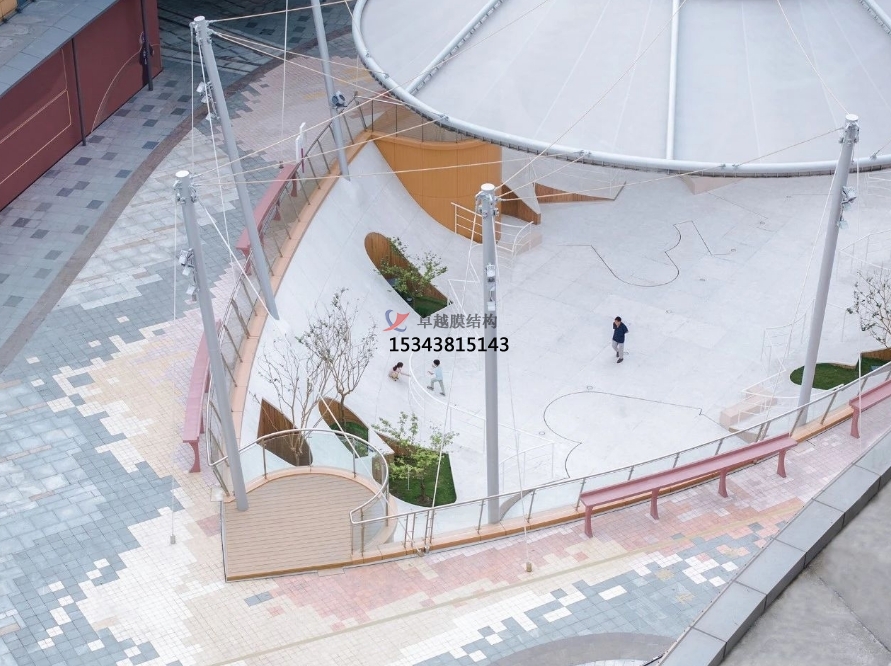 “浮庭”由上方如同水母般漂浮的半透明織物膜結(jié)構(gòu)與下方懸浮感的地景花園共同組成。膜結(jié)構(gòu)既成為了廣場(chǎng)的頂蓋,形成包覆與洞天的感受,也作為織連體引導(dǎo)主要流線銜接了室外幾個(gè)重要節(jié)點(diǎn)。結(jié)合原混凝土柱的加寬基礎(chǔ)上支起鋼柱,以懸吊與支承合作的形式將膜結(jié)構(gòu)撐起,減少了廣場(chǎng)中結(jié)構(gòu)的出現(xiàn)。