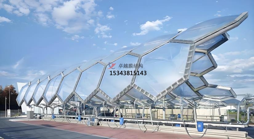以下是膜結(jié)構(gòu)產(chǎn)品的主要應(yīng)用和特點:膜結(jié)構(gòu)自行車棚和機動車棚,膜結(jié)構(gòu)景觀,膜結(jié)構(gòu)污水池加蓋,膜結(jié)構(gòu)體育場館和展會建筑,膜結(jié)構(gòu)藝術(shù)裝置,膜結(jié)構(gòu)充電樁和收費站。膜結(jié)構(gòu)自行車棚采用輕質(zhì)且堅固的膜材料,具備優(yōu)異的抗風(fēng)、抗雨雪能力,同時具有自潔性,減少維護成本。其優(yōu)雅的造型和多樣的色彩選擇,使其成為城市中的一道靚麗風(fēng)景線,而機動車棚的篷布采用PVC、PVDF、PTFE、ETFE等材料,具有高強度、耐久性好、防火難燃、自潔性強等特點。其透光率為13%,熱能反射率為73%,能有效減少熱吸收,使用壽命可達15-30年4。膜結(jié)構(gòu)景觀是一種耐用、高強度的涂層織物,具有柔韌的質(zhì)地、重量輕、透光性極佳等特點,常被用于公園、廣場等場所,成為吸引眼球的藝術(shù)景觀。隨著工業(yè)污染的加劇,膜結(jié)構(gòu)污水池加蓋因其環(huán)保、施工簡便等優(yōu)勢,逐漸成為工業(yè)污水處理的首選。其鋼材料使用量少,能有效解決池體跨度過大的施工難題。膜結(jié)構(gòu)在體育場館和展會建筑中的應(yīng)用,不僅縮短了建設(shè)工期,降低了造價成本,還減少了環(huán)境污染。其大跨度的設(shè)計和高透光性,為場館提供了良好的采光和空間感。膜結(jié)構(gòu)藝術(shù)裝置設(shè)計簡單、造型獨特,不僅具有藝術(shù)展示效果,還能為人們提供休息場所,廣泛應(yīng)用于公園、景區(qū)等場所。膜結(jié)構(gòu)充電樁和收費站以其耐用性和美觀性,成為現(xiàn)代城市基礎(chǔ)設(shè)施的重要組成部分,為人們提供便捷服務(wù)的同時,也大大提升了城市形象。