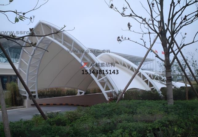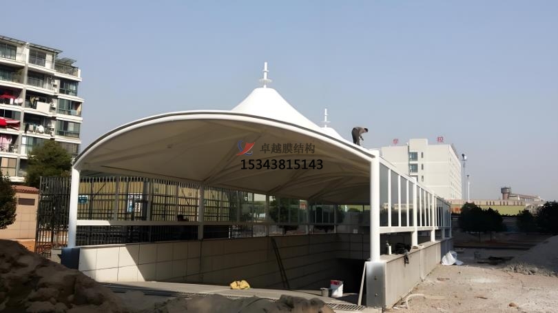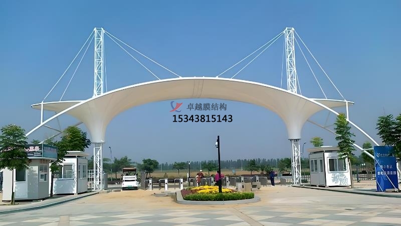 膜結(jié)構(gòu)出入口是一種以高強(qiáng)度膜材料與支撐結(jié)構(gòu)(鋼索、鋼架等)結(jié)合的建筑形式,具有輕盈、美觀、耐用等特點,廣泛應(yīng)用于各種場所的建筑形式,主要用于提供遮陽、遮雨的功能,同時具有較高的觀賞性和藝術(shù)感。