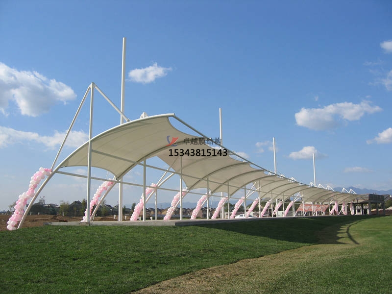 以膜材、鋼索及支柱構(gòu)成,利用鋼索與支柱在膜材中導(dǎo)入張力以達(dá)安定的形式。除了可實(shí)踐具創(chuàng)意,創(chuàng)新且美觀的造型外,也是更能展現(xiàn)膜結(jié)構(gòu)精神的構(gòu)造形式. 近年來,大型跨距空間也多采用以鋼索與壓縮材構(gòu)成鋼索網(wǎng)來支撐上部膜材的形式。膜結(jié)構(gòu)停車篷,因施工精度要求高,結(jié)構(gòu)性能強(qiáng),且具豐富的表現(xiàn)力,所以造價(jià)略高于骨架式膜結(jié)構(gòu)。