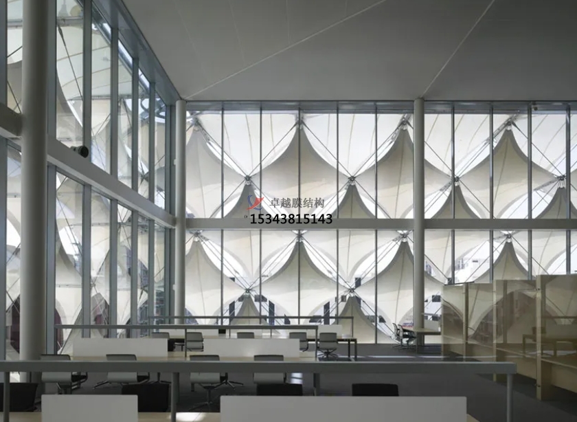 圖書館改建部分是一座正方體結(jié)構(gòu)的建筑。館區(qū)的樓墻分里外兩層,層次分明。每個(gè)層面都有各自的特點(diǎn),里層是玻璃和混凝土結(jié)構(gòu),外層是復(fù)雜的鋼結(jié)構(gòu),利用預(yù)應(yīng)力的外層鋼結(jié)構(gòu)支撐起非常立體的菱形紡織物的遮陽(yáng)蓬外表皮。