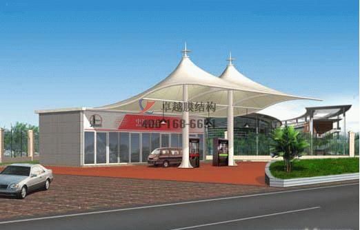 項(xiàng)目結(jié)構(gòu)形式:骨架式膜結(jié)構(gòu)加油站加氣站,四面自然排水,一側(cè)與站房搭接。