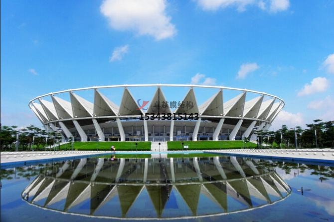 它的屋蓋為膜結(jié)構(gòu)屋蓋,屋蓋呈圓環(huán)型,外徑310米,內(nèi)徑125米。內(nèi)環(huán)由10根直徑8厘米的鋼索組成的受拉環(huán)。外環(huán)是受壓環(huán),分上下兩層,上層直徑310米,由直徑1米的鋼管混凝土組成;下層直徑275米,由直徑1.4米的鋼管混凝土組成,兩層鋼環(huán)間隔20m,中間由鋼管混凝土斜柱連接起來,形成倒圓臺形。