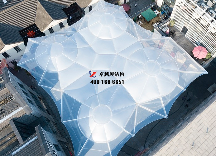 工程特點(diǎn):該項(xiàng)目是國(guó)內(nèi)好的單層ETFE加雙層氣枕膜完美嵌合的景觀雨棚建筑,利用ETFE膜材的高透光高自潔性以及雙層氣枕的隔熱能力,雨棚在具有遮陽(yáng)擋雨功能的同時(shí)還可以實(shí)現(xiàn)自然采光,行人沒(méi)有傳統(tǒng)密封建筑的束縛感;另一方面,ETFE膜結(jié)構(gòu)建筑是當(dāng)代更新的建筑應(yīng)用形式之一,工程高度定制,顏值高,具有好的性,天生自帶聚集人氣光環(huán)。