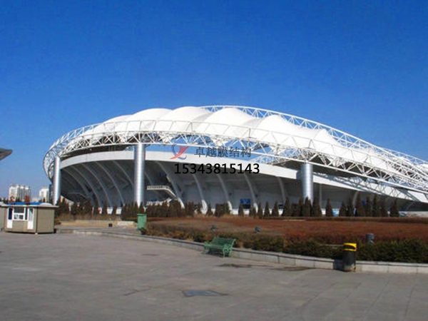 膜結(jié)構(gòu)的結(jié)構(gòu)形式:是由多種高強(qiáng)薄膜材料PVC或Teflon及加強(qiáng)構(gòu)件鋼架、鋼柱或鋼索通過一定方式使其內(nèi)部產(chǎn)生一定的預(yù)張應(yīng)力以形成某種空間形狀,作為覆蓋結(jié)構(gòu),并能承受一定的外荷載作用的一種空間結(jié)構(gòu)形式。