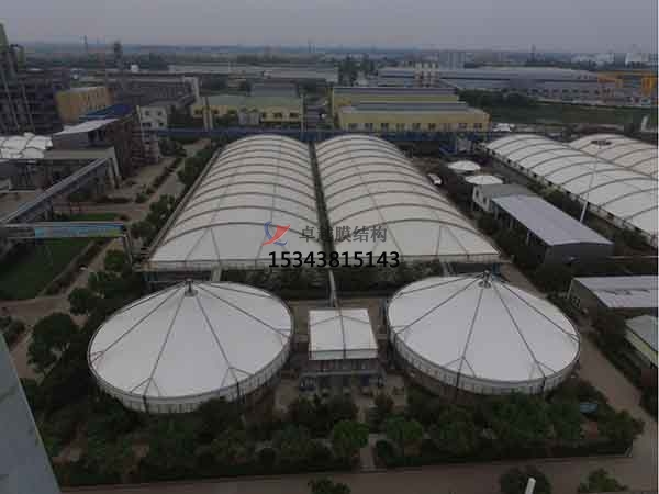 索膜結(jié)構(gòu)反吊膜應(yīng)用廣泛,常見于市政污水廠、化工廠、制藥廠、印染廠等領(lǐng)域的敞開式污水池密封,兼顧廢氣收集、景觀美化(曲面造型)及空間再利用(如池頂平臺(tái))。代表性案例如上海白龍港污水廠、齊魯石化污水處理項(xiàng)目等。