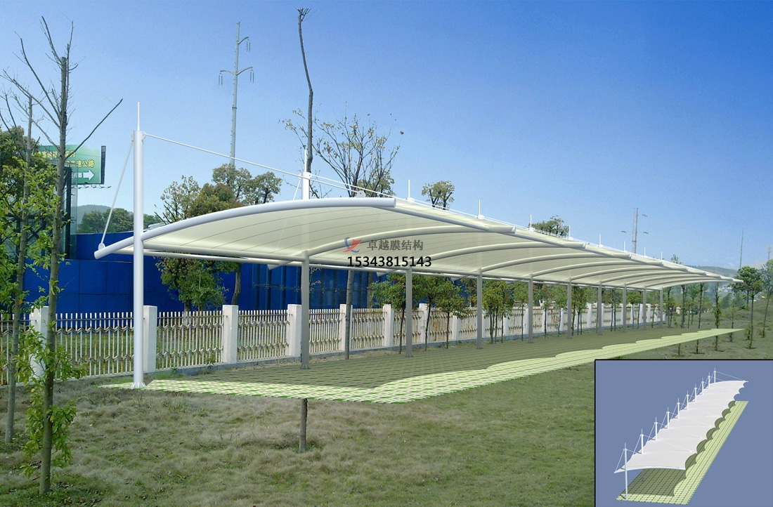 膜結(jié)構(gòu)停車場(chǎng)性能優(yōu)勢(shì):膜結(jié)構(gòu)停車場(chǎng)具有透光性好、隔熱性佳、自潔性強(qiáng)、抗震性強(qiáng)、防水性優(yōu)等特點(diǎn)。其中透光性好,是因?yàn)槟げ木哂幸欢ǖ耐腹饴?,能使自然光線透過(guò),形成柔和的漫射光,不僅可以節(jié)約白天的照明能源,還能提高停車場(chǎng)內(nèi)的視覺(jué)舒適度,減少照明設(shè)備的使用,降低能耗。隔熱性佳,優(yōu)質(zhì)的膜材具有良好的隔熱性能,能有效阻擋太陽(yáng)輻射熱,降低停車場(chǎng)內(nèi)的溫度,減少車輛因高溫而產(chǎn)生的損耗,同時(shí)也為停車者提供更舒適的環(huán)境。自潔性強(qiáng),膜材表面通常加涂有防護(hù)涂層,如聚氟乙烯、丙烯酸等,這些涂層具有不發(fā)粘、耐高溫的特點(diǎn),落到膜材表面的灰塵可以靠雨水的自然沖洗而達(dá)到自潔的效果,使停車場(chǎng)保持整潔美觀??拐鹦詮?qiáng),膜結(jié)構(gòu)具有良好的彈性和柔韌性,在地震等自然災(zāi)害發(fā)生時(shí),能夠通過(guò)自身的變形來(lái)吸收和耗散能量,有效抵抗地震力,保障停車場(chǎng)的結(jié)構(gòu)安全和車輛的停放安全。防水性優(yōu),膜材本身具有優(yōu)異的防水性能,拼接處經(jīng)過(guò)專業(yè)處理,能有效防止雨水滲透,為車輛提供可靠的遮雨保護(hù),避免車輛遭受雨水侵蝕。