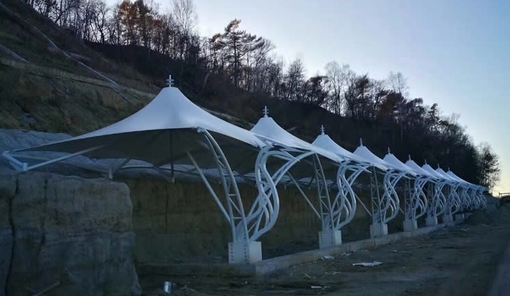 工程施工地址:黑龍江伊春市嘉蔭縣 膜材選材型號:法國 法拉利膜材PVDF 1202T2 選用膜材拉力:5900N-6900N 鋼構選用材料: 鞍鋼生產(chǎn)的Q235B高頻焊管及Q345無縫鋼管 工程施工周期:總工期29日歷天 索膜結構形式:管桁架四邊張拉索膜結構看臺 工程完工面積:膜材展開面積589㎡" />