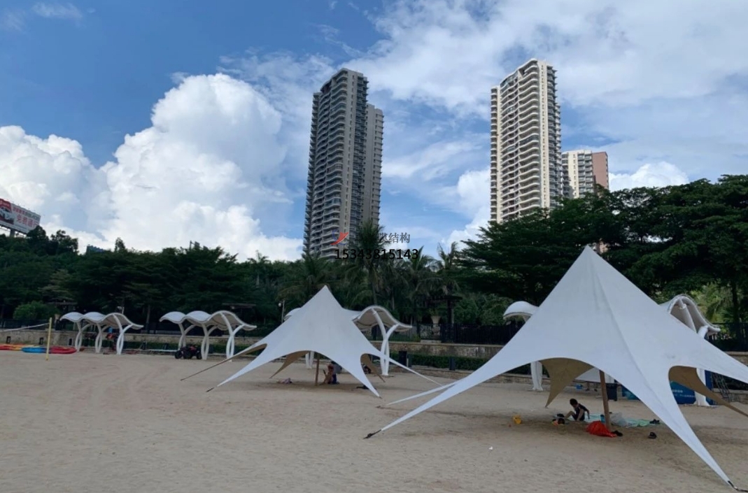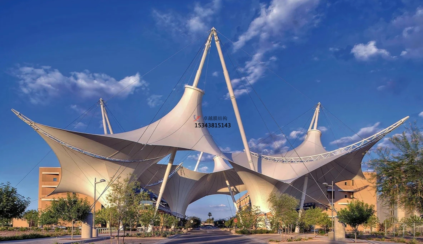 景觀棚膜結構最大的特點之一就是其幾乎不受限制的造型能力。設計師可以根據不同的場地需求、文化背景以及功能要求,創(chuàng)造出如貝殼般優(yōu)雅的曲線、如帆船般靈動的輪廓、如花朵般綻放的形態(tài)等等。這種獨特的造型不僅能夠成為視覺上的焦點,提升整個區(qū)域的景觀品質,還能很好地與周圍的自然環(huán)境或建筑風格相融合,形成和諧統(tǒng)一的整體畫面。