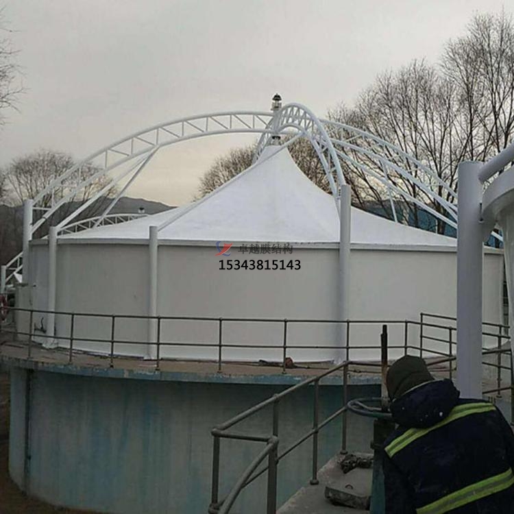 鋼架反吊膜結(jié)構(gòu)是專門用于污水池加蓋密閉的一種膜結(jié)構(gòu)形式,結(jié)構(gòu)形式新穎,防腐耐霉,由鋼結(jié)構(gòu)、膜結(jié)構(gòu)及安裝輔件構(gòu)成,根據(jù)不同污水池現(xiàn)場條件進行個性化設(shè)計安裝。鋼結(jié)構(gòu)在外部形成穩(wěn)定受力結(jié)構(gòu),膜材料反吊與機構(gòu)內(nèi),隔絕廢氣對剛架構(gòu)的腐蝕。鋼架反吊膜分為圓形反吊膜和方形反吊膜,其中方形反吊膜又分為拱形及吊帽結(jié)構(gòu)。