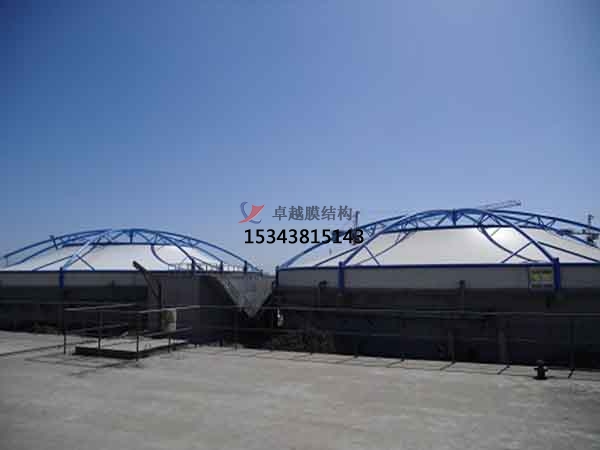 污水池加蓋主要分為三種加蓋形式:普通碳鋼骨架+陽(yáng)光板、不銹鋼骨架+玻璃鋼板、反吊膜。普通碳鋼骨架+陽(yáng)光板、不銹鋼骨架+玻璃鋼板為傳統(tǒng)加蓋方式,易被廢臭氣腐蝕,且胯度小,密封性差,已逐漸被市場(chǎng)淘汰。