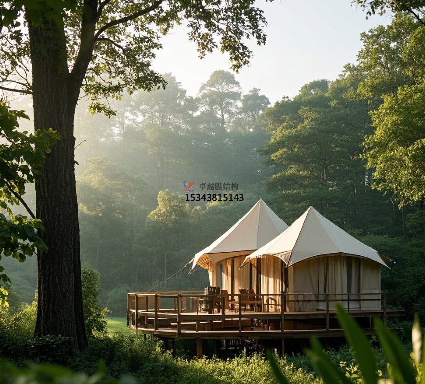 帳篷酒店膜結構主要由膜材與支撐體系構成。膜材作為核心部分,常用的如聚四氟乙烯(PTFE)膜材,具備超強耐候性,能在風吹日曬、雨雪侵襲下長期保持穩(wěn)定,不易老化損壞,且自潔性能出色,表面不易沾染污垢,始終維持潔凈外觀;乙烯 - 四氟乙烯共聚物(ETFE)膜材透光性極佳,可使充足自然光灑入室內,營造明亮溫馨的居住氛圍,同時具備較高強度與柔韌性。支撐體系則包括鋼結構、鋁合金結構或索結構等,為膜材提供穩(wěn)固支撐,確保整個帳篷結構的安全性與穩(wěn)定性。