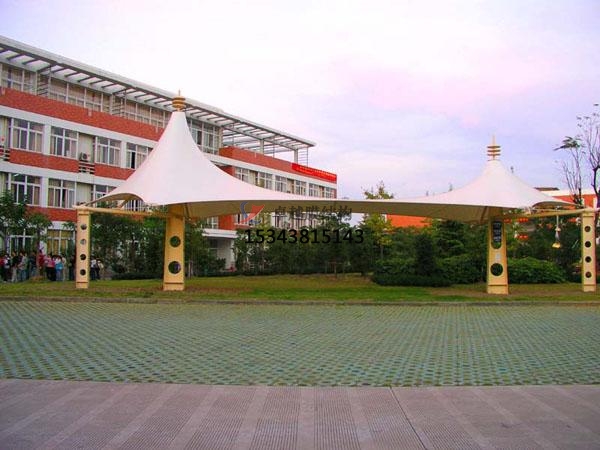 商業(yè)廣場雨棚搭建以其輕盈飄逸的造型、柔美并帶有力量的曲線和大跨度和大空間的鮮明個(gè)性和標(biāo)識(shí)性,并與園林景觀溶為一體。創(chuàng)造出讓人們盡情享受的快樂空間。充分展示了結(jié)構(gòu)構(gòu)件清晰受力的藝術(shù)之美,它巧妙的整合周圍的環(huán)境,給人們一種高貴典雅、浪漫溫馨之感。另外由于張拉膜材料本身特有的顯色性,在夜間彩燈的映射下能形成絢麗繽紛的景觀。不僅為人們提供遮陽避雨的空間。同時(shí),更由于這種生動(dòng)活潑的造型能給人們帶來時(shí)尚、輕松的休閑感受,所以廣受歡迎。