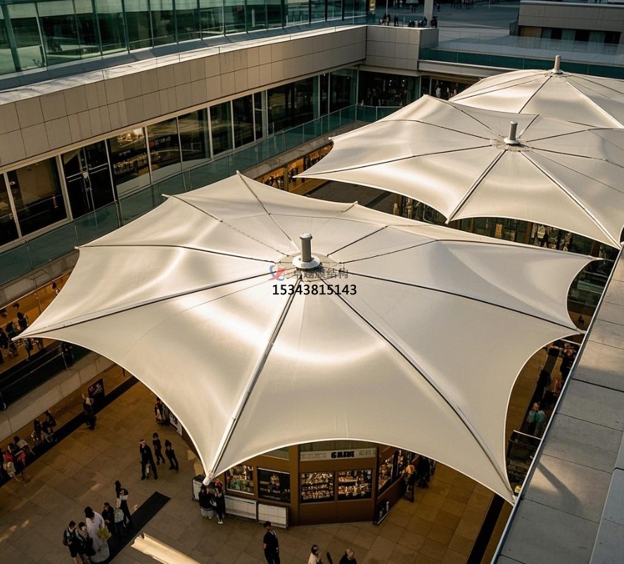 露天步行商業(yè)街的公共座椅旁,膜結(jié)構(gòu)遮陽傘是常見的配置。它與傳統(tǒng)可移動(dòng)遮陽傘不同,采用先預(yù)埋基礎(chǔ),再搭建鋼構(gòu),最后張拉膜材的方式固定。其造型豐富多樣,顏色可根據(jù)整體環(huán)境定制,不僅具備出色的抗紫外線、抗老化性能,使用壽命長,而且自潔性好,為商業(yè)街增添了一抹亮麗色彩,成為實(shí)用與美觀兼具的景觀設(shè)施。