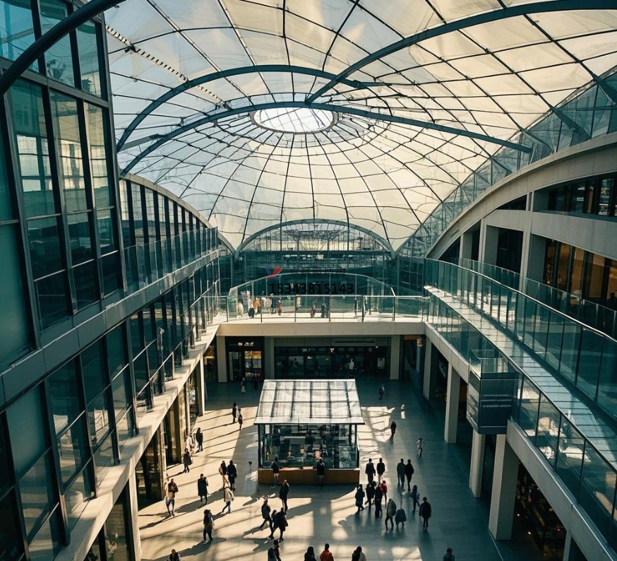 在大型商業(yè)廣場的廊道或大廳頂部,常能見到膜結(jié)構(gòu)穹頂與天幕的身影。以往,實(shí)現(xiàn)自然采光多依賴陽光板或鋼化玻璃,然而陽光板易老化,鋼化玻璃自重過大且存在安全隱患。膜結(jié)構(gòu)的出現(xiàn)改變了這一局面,PTFE 及 ETFE 膜材透光性佳、自重輕、安全性高,尤其是 ETFE,其高自潔、高透光特性,讓穹頂天幕在白天引入充足自然光線,節(jié)省照明能耗,夜晚在燈光映照下,又營造出如夢(mèng)如幻的氛圍,為顧客帶來獨(dú)特的購物體驗(yàn)。