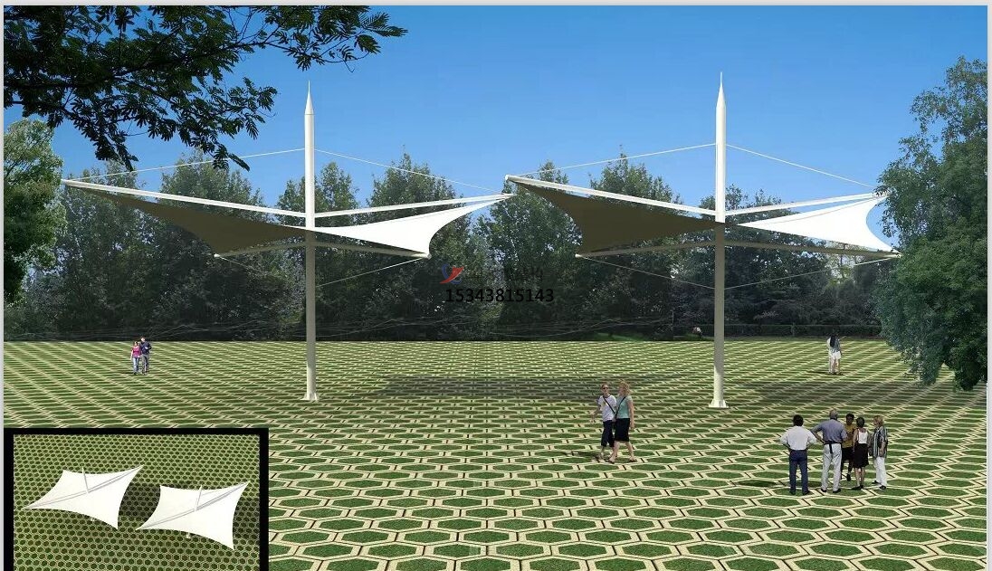 6、景觀設(shè)施:膜結(jié)構(gòu)以其特殊的建筑表現(xiàn)手法,主要體現(xiàn)在造型、漫射透光性、豐富多彩,可廣泛應(yīng)用于入口、標(biāo)志性小品 、步行街、停車場等,其他建筑特性無須較高要求。